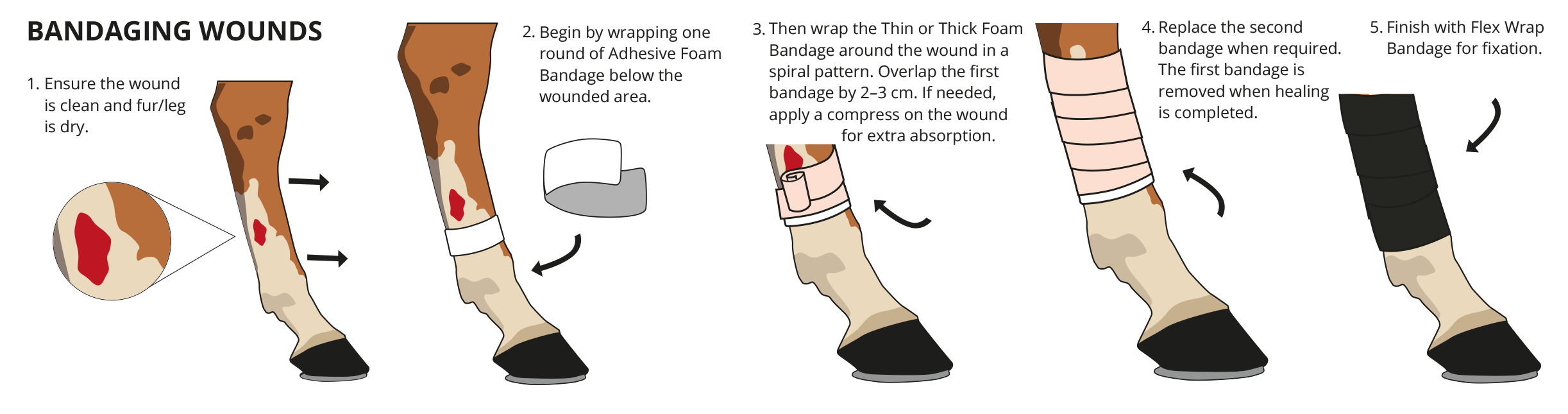 Bei Pferden kann es vor allem direkt nach der Verletzung zu Wundheilungsstörungen kommen, daher ist eine schnelle Versorgung einer akuten Wunde besonders wichtig. Durch schnelles Handeln können Pferdehalter die Heilungsdauer reduzieren. Durch das Anlegen eines Wundverbandes wird die verletzte Stelle stabilisiert und der Schmerz gelindert.